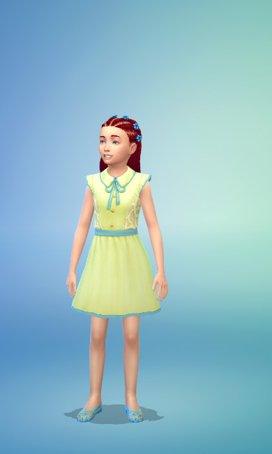 As sapatilhas e presilhas deste penteado, que fazem parte do pacote de jogo ‘Vida em Família’, têm o tom ideal de azul para combinar com os detalhes do mesmo tom que enfeitam esse charmoso vestidinho amarelo da coleção de objetos ‘Jardim Romântico’.