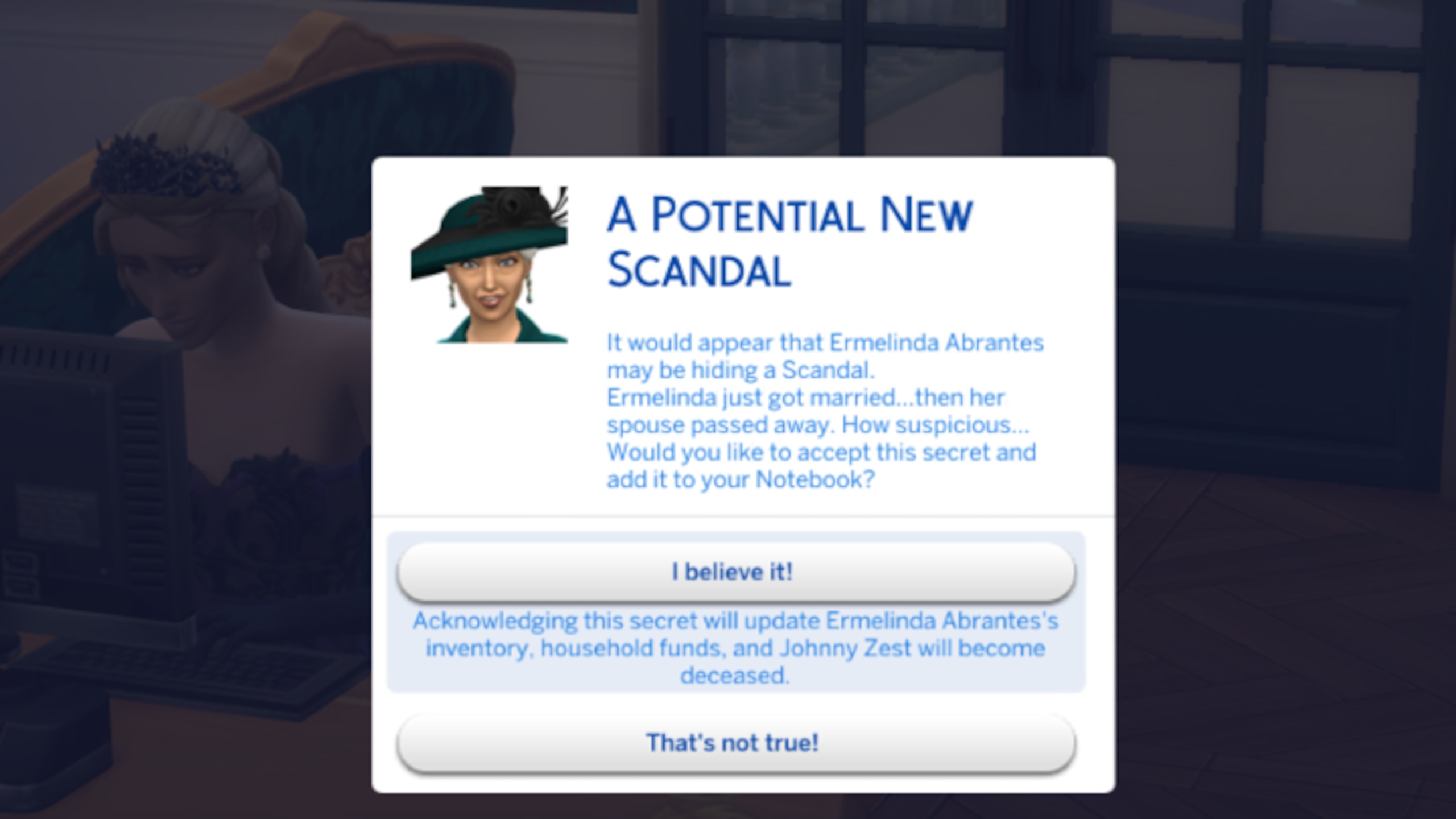 Nossos Sims sempre gostaram de aprontar, e nós queríamos descobrir um jeito de garantir que essas desventuras tivessem um significado. Para isso, criamos o sistema de Escândalos: gerar e acompanhar drama, além de dar a vocês novas formas de brincar com suas histórias.
