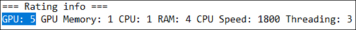 - Avaliação da GPU, que deve ser a primeira informação logo abaixo de ‘=== Rating info ===’, por exemplo GPU: X (X sendo a nota que o The Sims 3 dá à sua placa de vídeo e espera rodar dentro deste parâmetro, numa escala de 1 a 5). Observe a captura de tela.
