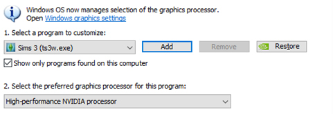- No menu suspenso, em ‘Selecione um programa para personalizar‘, localize o ‘Sims 3 (ts3.exe)‘ se você instalou seu jogo na Origin (1.69), ou localize o ‘Sims 3 (ts3w.exe)‘ se você o instalou na Steam ou via CD (1.67). Se nenhum executável do jogo aparecer, clique em ‘Adicionar‘ e role a página até encontrá-lo, ou navegue pelos arquivos do jogo manualmente.