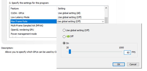 - Em ‘Especificar as configurações deste programa‘, role a página para baixo até encontrar a configuração ‘Taxa máxima de quadros‘. Habilite-o e defina o limite de FPS desejado. lembre-se que 60 é o máximo recomendado. Em seguida, role a página novamente para baixo e ative a ‘Sincronização Vertical‘ e o ‘Buffer Triplo‘.